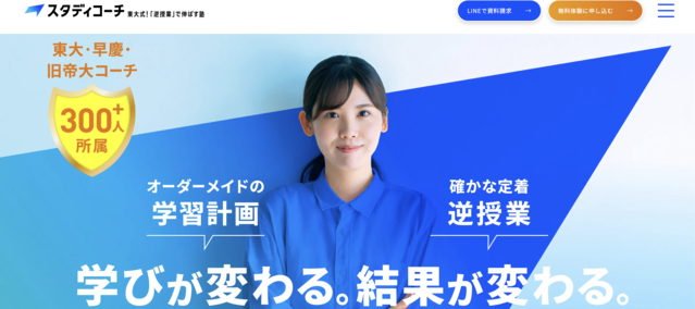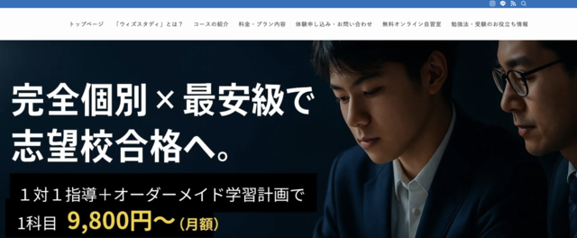 特徴 | ・志望校合格から逆算したオーダーメイドの年間学習計画を作成 ・週1回のコーチングで学習の進捗管理と勉強法を指導 ・「スタディサプリ」の映像授業が見放題で、参考書学習と組み合わせる ・受験科目全てを対象に、総合点を最大化するための戦略的な指導 |
