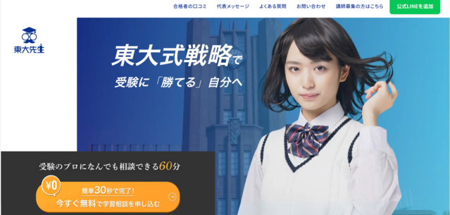 特徴 | ・入会金19,800円+授業料のみで教材費・管理費・解約金なしのシンプル料金体系 ・社会人プロ講師を事前動画で指名でき、相性が合わなければ交代無料 ・完全オンライン&最短当日スタート、45〜60分の無料体験からすぐに本授業へ移行可能 ・科目・学年・目的別に細分化されたコース(発達障害・海外子女・公務員試験など)でニーズに合わせやすい |
